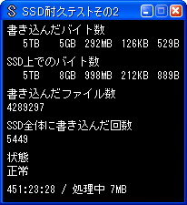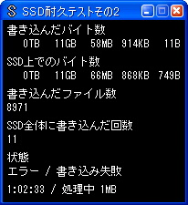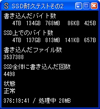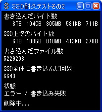 6TBを超えたところでエラーになった。最終的にGB単位で計算するので、ここに表示されているのは書き込んだ容量の1GB分なのだが、あまりにもエラーの気配が感じられず間違ったかな……と不安になってしまったが、どうやら正しかったようだ。ちなみに書き込んだファイル数だが、ライトキャッシュをフラッシュした回数を加算してしまったので、実際はもっと少ない。