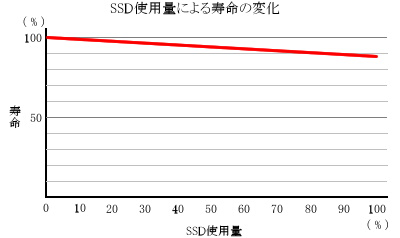 SSD使用量が、どれだけ寿命に影響するかグラフにしてみたが、ほとんど影響していないことがわかる。必死になって空き容量を稼いでいると、寿命を大幅に延ばせたような気分に浸ってしまうが、実際は数%程度、つまり誤差の範囲でしかなかったようだ。