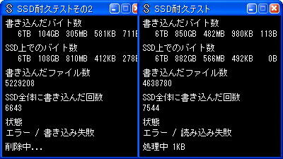 左側が今回の結果で、右側が前回の。書き込めたのは6×1024+104で6248GBだ。前回の6994GBと比較すると、746GB少なかった。
