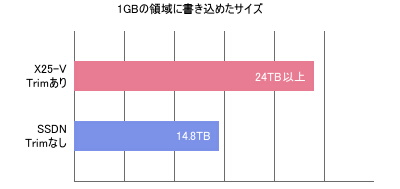 恐らくX25-Vの異常な寿命は(推定では156.2TB)、Trimコマンドによるものではなくて、SSDの中に住みついた魔物が原因と思われる。40GBという中途半端な容量も、悪魔の取り分と解釈すれば納得いく。しかしそうなるとSSDNと単純に比較できないので、新たな比較対象が必要になってくる。
