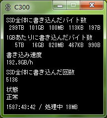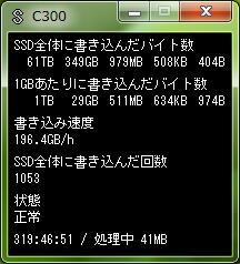 現在1053回、合計61.3TB書き込めた。前回までは「1GBあたりに書き込んだファイル数」を表示していたが、今となっては意味のない値になってしまったので、「書き込み速度」を表示することにした。