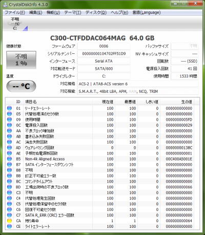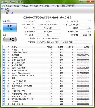 嬉しいことにウェアレベリング回数(AD、中央少し上)がわかるようだ。これは残り寿命(CA、下から2番目)と連動しているのだろうか、どちらも80になっている。1053回で80ということは、約5000回で0になるようだが、やっぱりこの値も単なる目安であって、0になっても延々と書き込めるんだろうか。