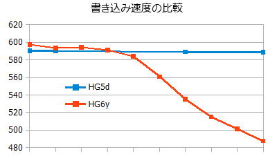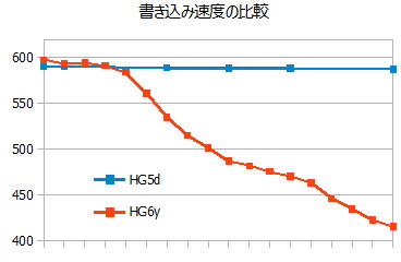 こうして比較してみると、HG6yの書き込み速度が落ちていくのがわかる。HG6yはランダムアクセスを強化したようだが、その代わり連続的な書き込みは軽視したのだろうか。それとも空き容量が減ったあとに、速度が回復できなくなっているのだろうか。耐久テストでは空き容量が可変するため、稀に残り10%近くまで迫ることもあるが、HG5dのときは問題なく速度を維持できていた。