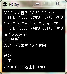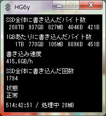 現在1049回、合計122.2TB書き込めた。気になるのは書き込み速度で、487.7GB/hしか出ていない。HG5dが588.8GB/hだったことを考えると、後継機とは思えない遅さだ。