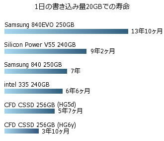 いつものように寿命を比較してみたが、悪いほうに大きく記録更新してしまった。これは最悪値での比較なので、普通に使うならば5年や10年は問題ないと思われるが、ここまで急激に下がってしまうと、この先の微細化が少々不安になってくる。