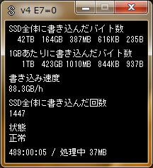 ある程度使用したSSDのデータ保持期間も気になるので、E7=0を目安にして調べてみる。1447回書き込んでE7=0になった。