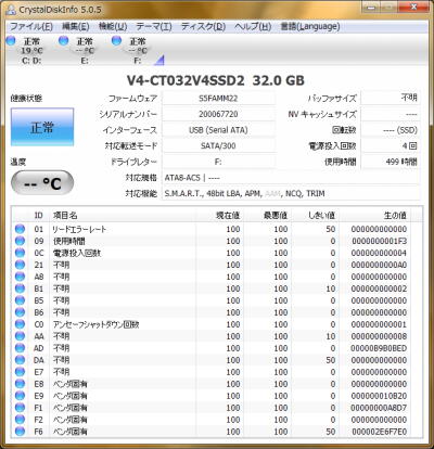 リードエラーレート(01、1番上)の生の値が2045になっている。まだファイルを削除したり書き込んだりできるので、SSDが壊れたわけではなくて、長期間のデータ保持ができなかったということだろう。次は4ヶ月のを確認する予定。